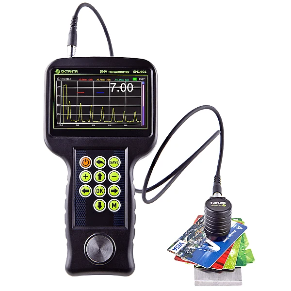 Толщиномер EM1401 UT имеет цветной дисплей, защищённый ударопрочным стеклом. Как и все ЭМА толщиномеры выпускаемые нашей компанией, толщиномер EM1401 UT использует специальный алгоритм обработки данных, который позволяет корректно измерять толщину в автоматическом режиме при наличии мешающих факторов, таких как анизотропия металла, наличие нескольких отражателей, наличие внешних помех. Помимо автоматического режима измерения толщины прибор позволяет использовать ручные режимы измерения по первому эхо-сигналу и по разности между любыми двумя эхо-сигналами. Ручной режим рекомендуется использовать на сильно корродированных объектах.