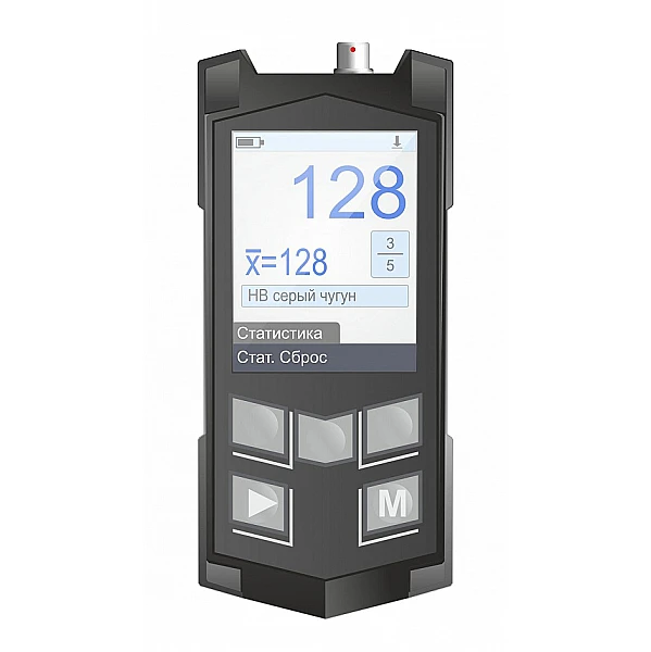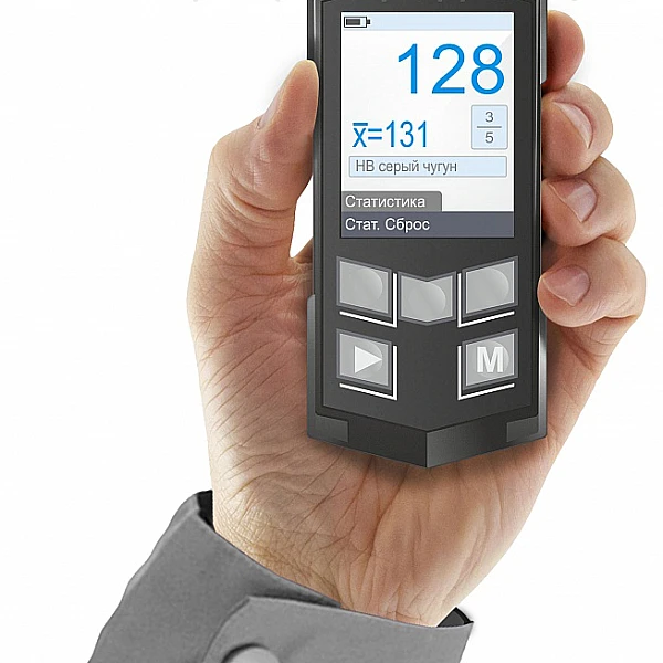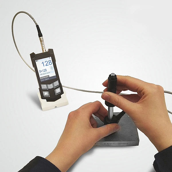 Малогабаритный прибор с набором сменных преобразователей, предназначенных для достоверного измерения твердости и временного сопротивления σ широкого спектра сталей (углеродистых, низколегированных, высоколегированных, нержавеющих), чугунов и цветных металлов.