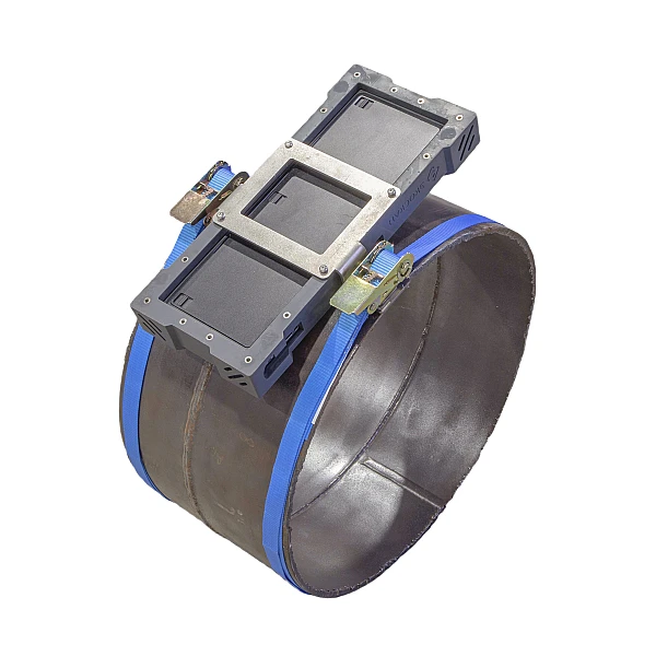 Защитный чехол имеет возможность позиционирования на объекте контроля с помощью ремней, которые могут либо охватывать объект, либо растягиваться на специальных магнитных креплениях.