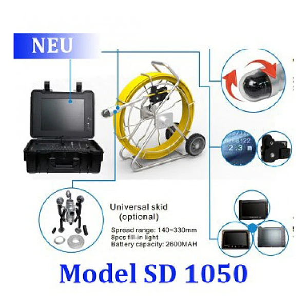 Лучшая цена на систему телеинспекции Schroder Sd Series с поворотной камерой. Наш комплекс применятеся для визуального обследования канализационных и вентиляционных систем, скважин, цистерн, емкостей и полостей. Армированный многожильный кабель со стеклпластиковым заполнением имеет длину 60 м