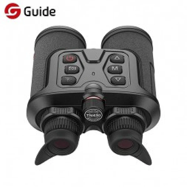Визуально тепловизионный бинокль выглядит несколько необычно – внешне он напоминает бинокль, внутри это конструкция с одним объективом и двумя цифровыми экранами для комфортного наблюдения. Изображение с объектива обрабатывается и передаётся на оба экрана, что позволяет комфортно выслеживать цель на охоте, не утомляя глаза. Тепловизионный бинокуляр разработан на базе неохлаждаемого ик-детектора VOx, и полноцветным OLED-дисплеем с высоким разрешением 1024×768 пикселей. Плотность пикселей у TN430 составляет 17μm, инженеры Guide позаботились об идеальном качестве изображения. Частота обновления изображения составляет 50 Герц. Изображение плавное и чёткое, не дёргается как у тепловизоров с 9Гц.